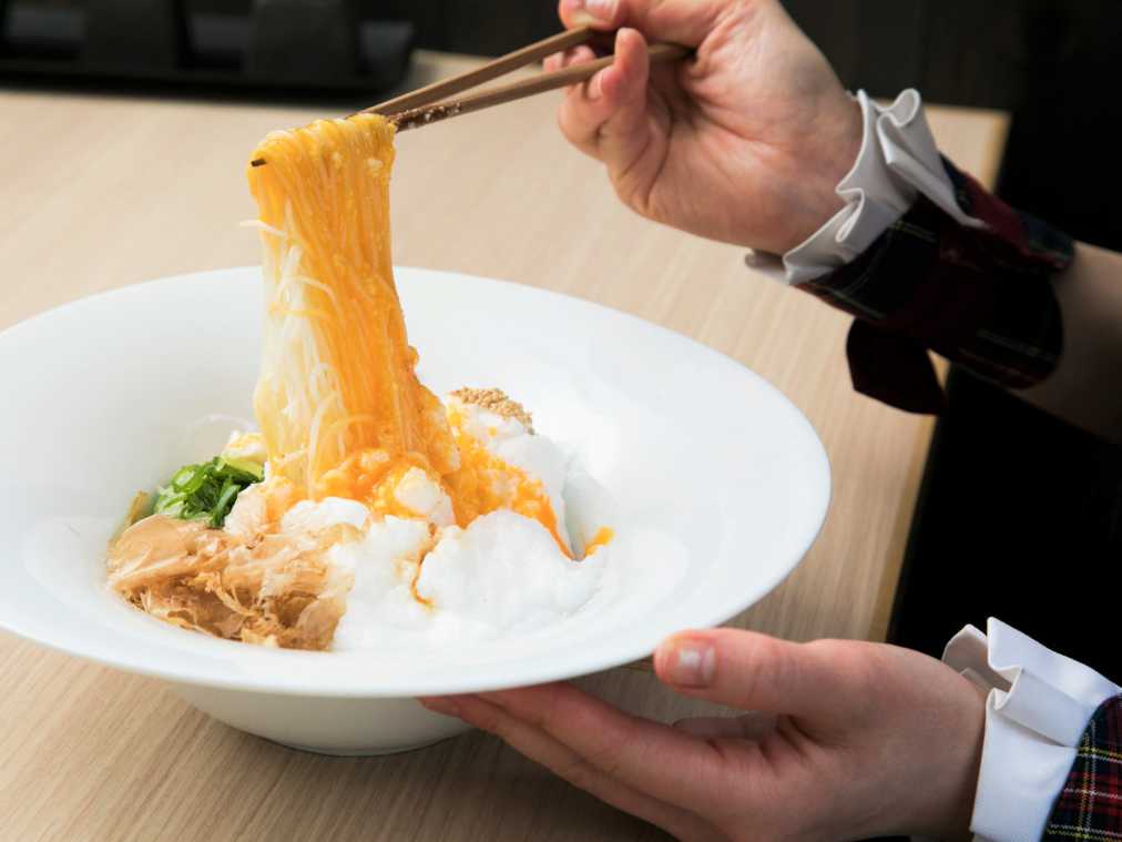 真っ白なメレンゲがインパクト大の「ふわふわ釜玉そうめん」は定番の人気メニュー。