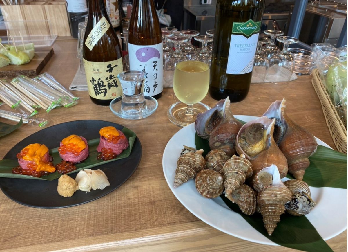 北海道の新鮮魚介メニューが満載の「魚貝と野菜札幌さんど。神宮前」。名物は活きホタテの浜焼きウニのせ1091円など。どれもお酒がすすみそう。なみなみと注いでくれる日本酒やワインと一緒に味わって。店頭に並ぶもうひとつのおすすめ、北海道の小麦を使ってつくられたメロンパン380円も要チェックですよ。