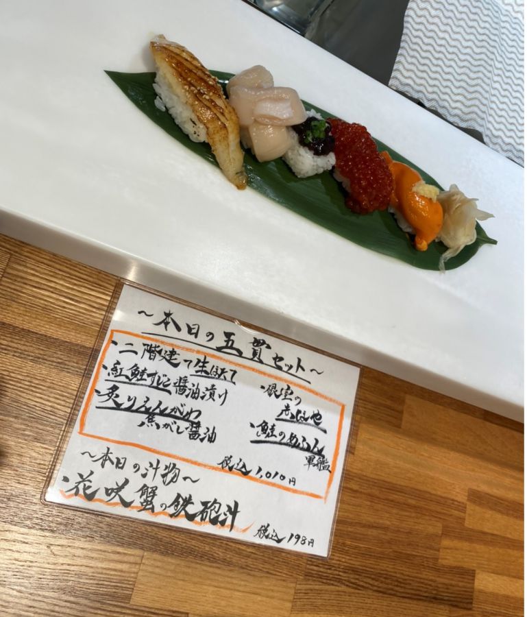 サクっと立ち食いでお寿司をいただける「立ち食い寿司根室花まる」。圧倒的な鮮度のよさに驚くお寿司の数々。イチオシメニューは本日の五貫セット。その日のおすすめ5貫がセットになり、おいしいところを逃さず食べられるのがうれしいところ。寿司職人の握りの手さばきを目の前に、おいしいお寿司をいただけます。