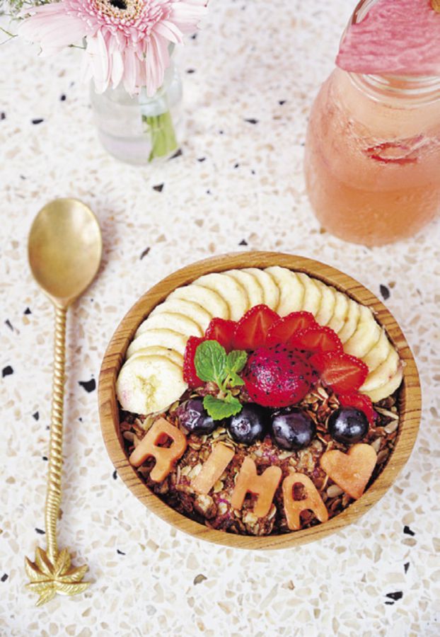 ピンクの看板が目印のカフェ。人気のスムージーボウルは好きな文字でのデコレーション(8文字まで)が無料でリクエストできちゃいます。写真のメニューは「ベリー・トロピカル(Rp.7万9000)」。バナナやドラゴンフルーツのスムージーの上にフルーツがのっていてボリューム満点です!