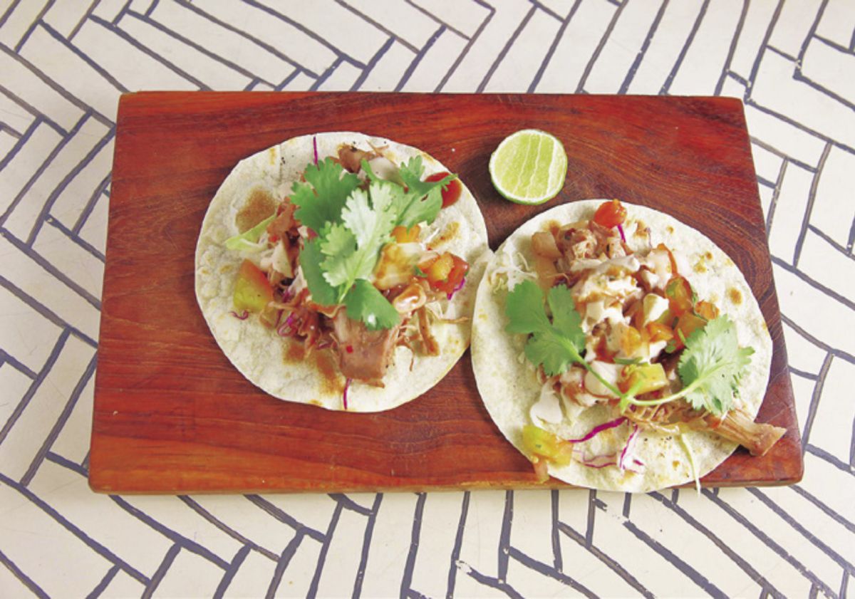 サーカスをイメージしたカラフル&ポップなイラストが描かれた建物が話題のカフェ。写真のり料理は、自家製BBQソースがかかった人気メニュー「ジャックフルーツのタコス(Rp.5万5000)」。