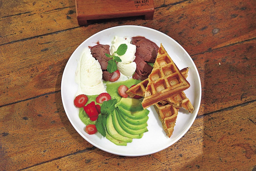 ホステル併設の隠れ家風ガーデンカフェ。バリ人オーナーがコーヒー好きの友人を呼べるように始めたのがオープンのきっかけなのだそうです。コーヒーと相性バツグンのワッフルやパンケーキはRp.3万5000で楽しめます。