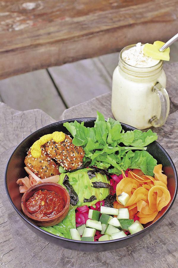 チャングーエリアのメインストリート、パンタイ・バトゥ・ボロン通りの中心部にあるカフェ。地元でも評判のオーガニック素材のヘルシーメニューが揃っています!写真のサラダボウル(Rp.7万5000)は、ビーツを練り込んだライスヌードルにアボカドやキュウリなどの野菜や豆腐などをのせたもの。ピーナッツソースにからめて食べます。メニュー名はなんと「カワイイ・ボウル」!