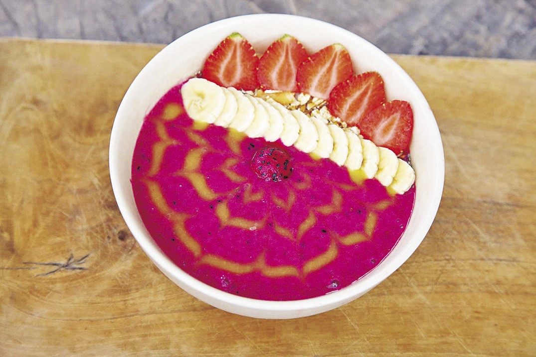 こちらはビビッドな色が印象的なスムージーボウル(Rp.6万9000)。メニュー名は「ナガ・ドラゴン」。ドラゴンフルーツのスムージーにチアシードやグラノーラなどが入っていてヘルシーな一皿。