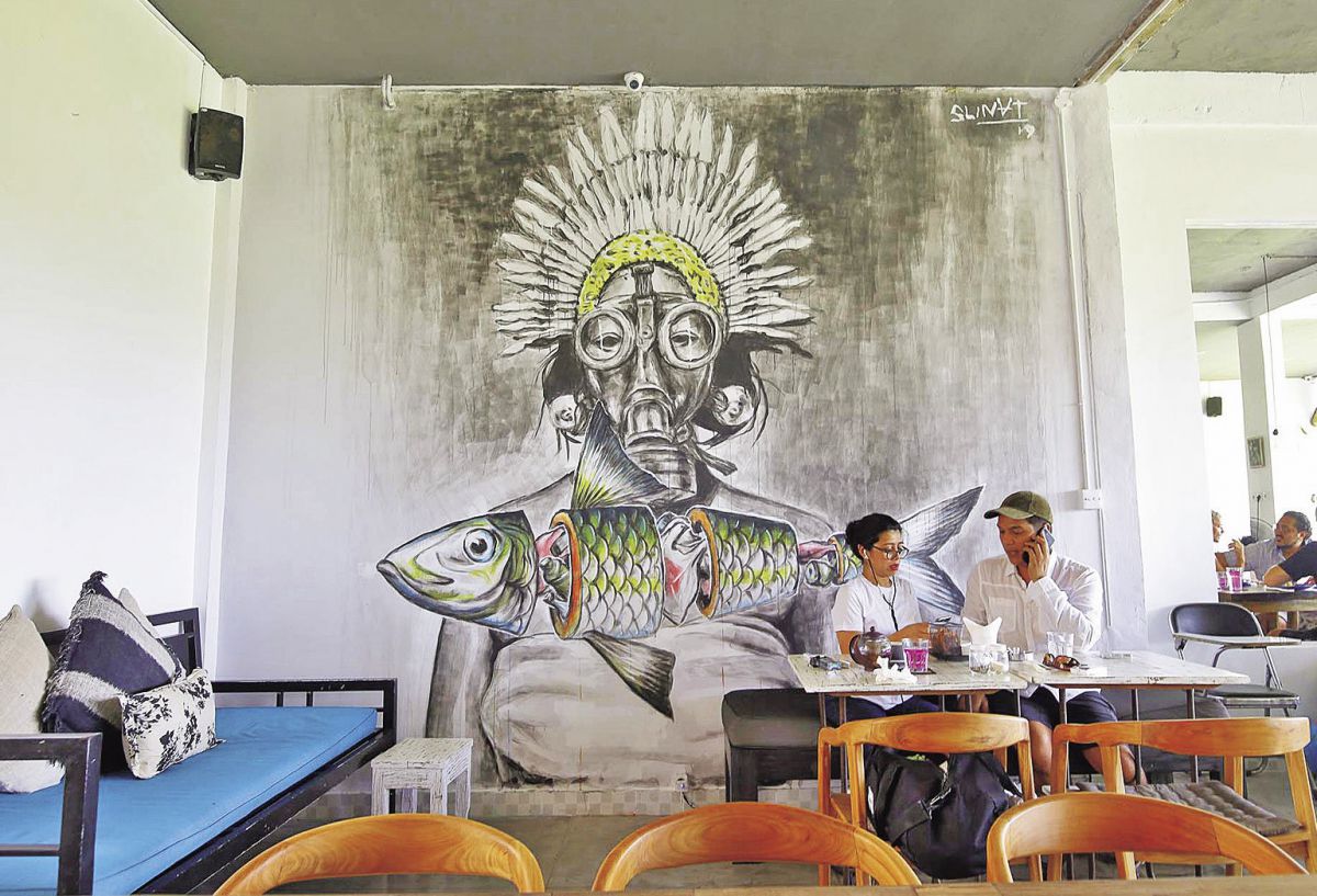 店内には目を引くウォールアートが!奥の席からは田園風景が見えます。パンケーキ(Rp.5万5000)、ナシゴレン(Rp.4万~)など多彩なメニューが楽しめるのも人気のヒミツ。また、17時まではウェルカムドリンクとしてデトックスウォーターを提供してくれるんです!