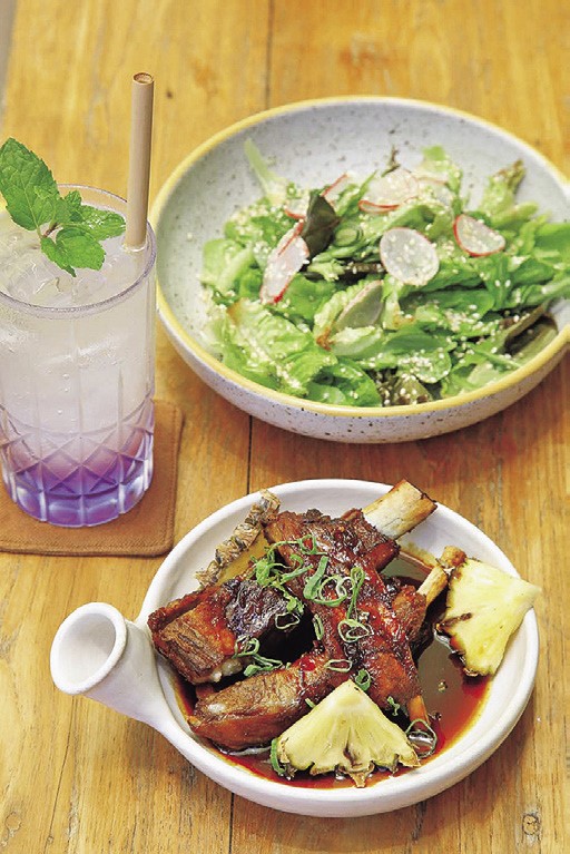 写真手前のポークリブ(Rp.9万)はほろりと肉がとれるほどやわらか!サンバル入りのBBQソースもピリ辛でおいしいんです◎。写真奥のサラダ(Rp.4万)はゴマの香りが豊かな、新鮮な葉野菜とラディッシュがたっぷり。自家製ドレッシングでいただきます!