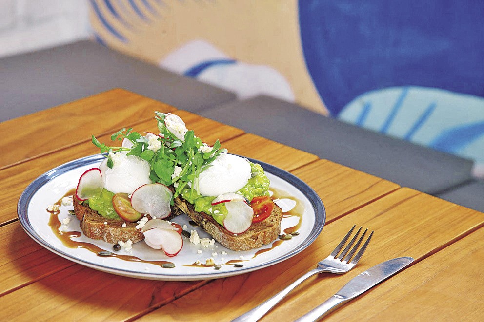 サーファーやヨガ好き女子たちの朝食スポットとして人気の「ルコ・カフェ」。写真の「アボ・スマッシュ(Rp.6万)」はトーストにポーチドエッグ、 フェタチーズなどをのせ、バルサミコ酢のドレッシングをかけた人気朝食メニューです。朝食メニューは7時 30分から終日オーダーできるそう。