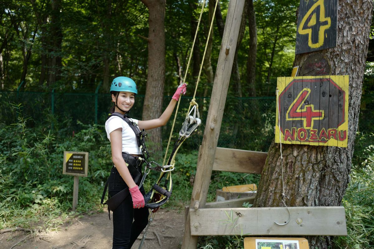 東京から出発した二人が最初にやってきたのは、「那須の森の空中アスレチック『NOZARU』」。約2万5千平方メートルの森林と傾斜地で、新感覚アトラクションを楽しめる、日本最大級規模のアスレチック施設です。装備をしっかり整えたら、早速アスレチックに向かいます。二人で「行ってきます!」と元気に出発です。