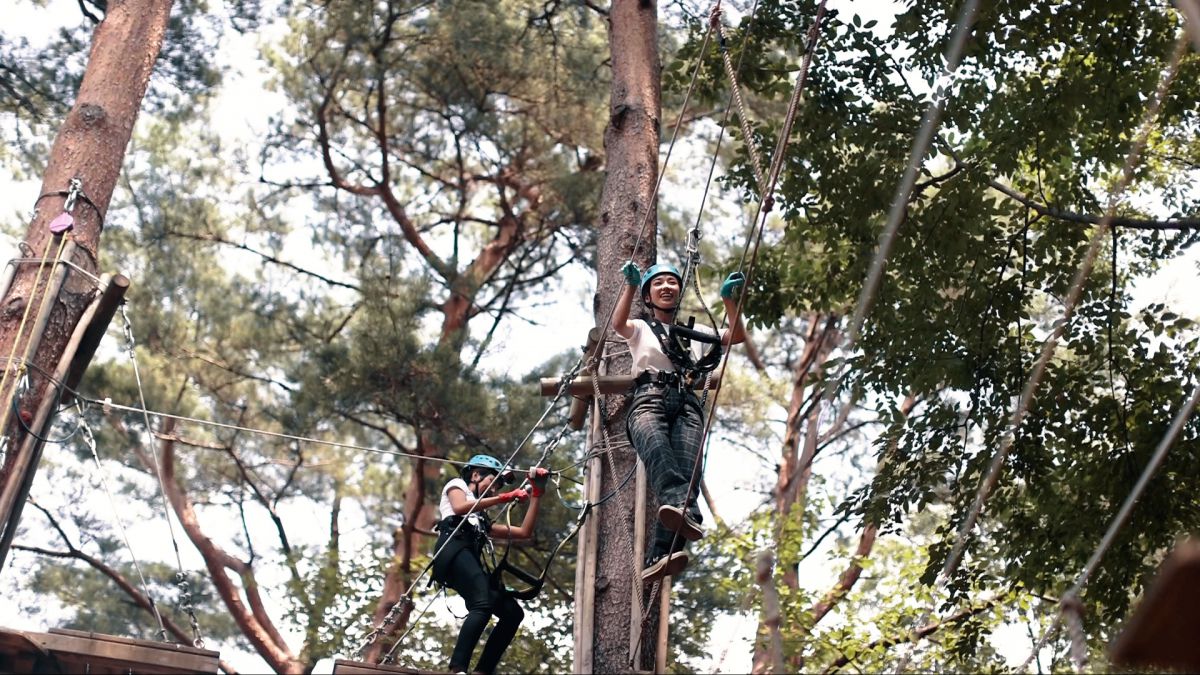 数々のアスレチックの中でも、こちらの木から木へと辿る綱渡りはスリル満点。足がすくむような高所を、か細いロープを頼りに進みます。