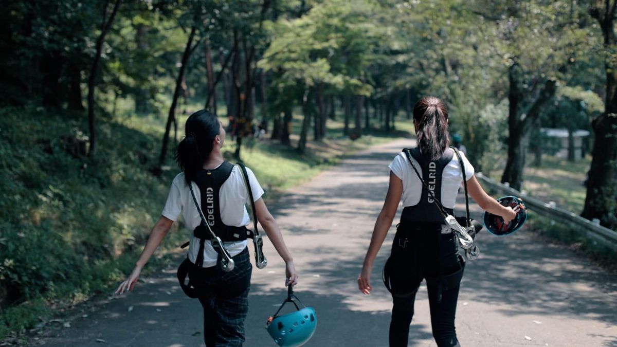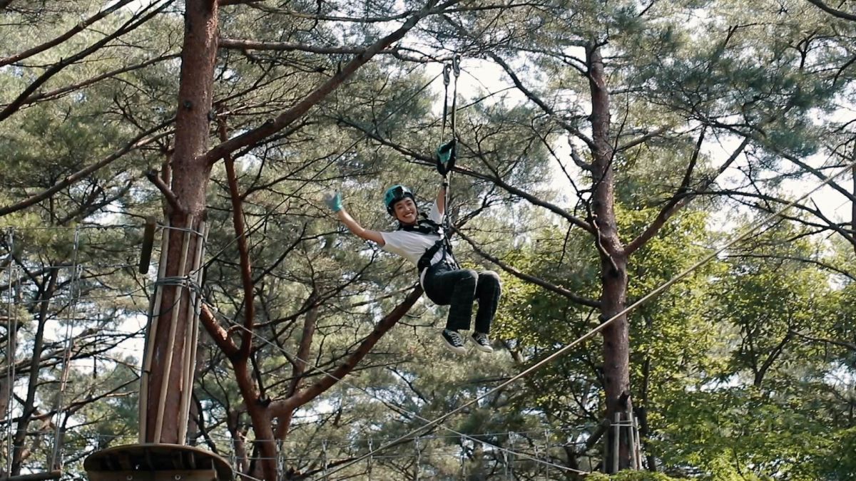 こなしていくうちに体の動かし方を覚えてきた松本さんと児玉さん、だんだん緊張もほどけ、最後は元気よくジップラインへ!大自然の中を高速で駆け抜けるジップラインは、那須高原の風を感じられる最高のアクティビティです。