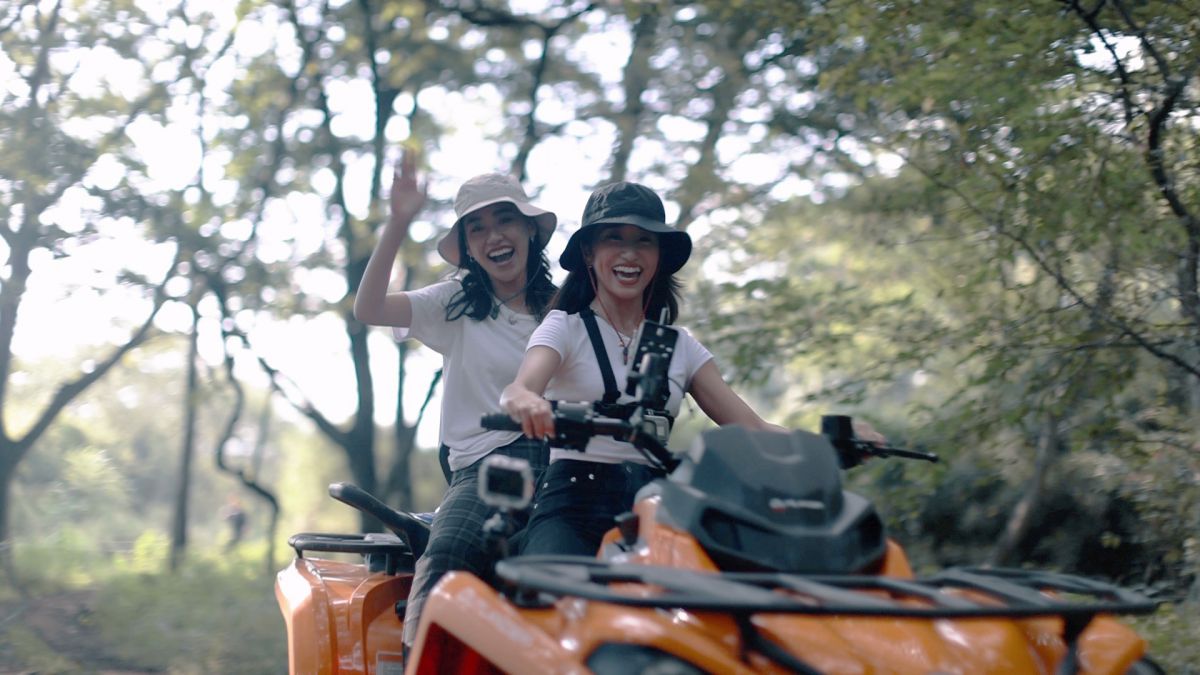 二人ともバギーに乗るのはこれが初めて。スタッフの方が丁寧に乗り方を教えてくれるので、初心者でも安心です。大きな車体は、森の中のでこぼこ道も、高低差のある岩肌も、水の中でもぐいぐい進みます!