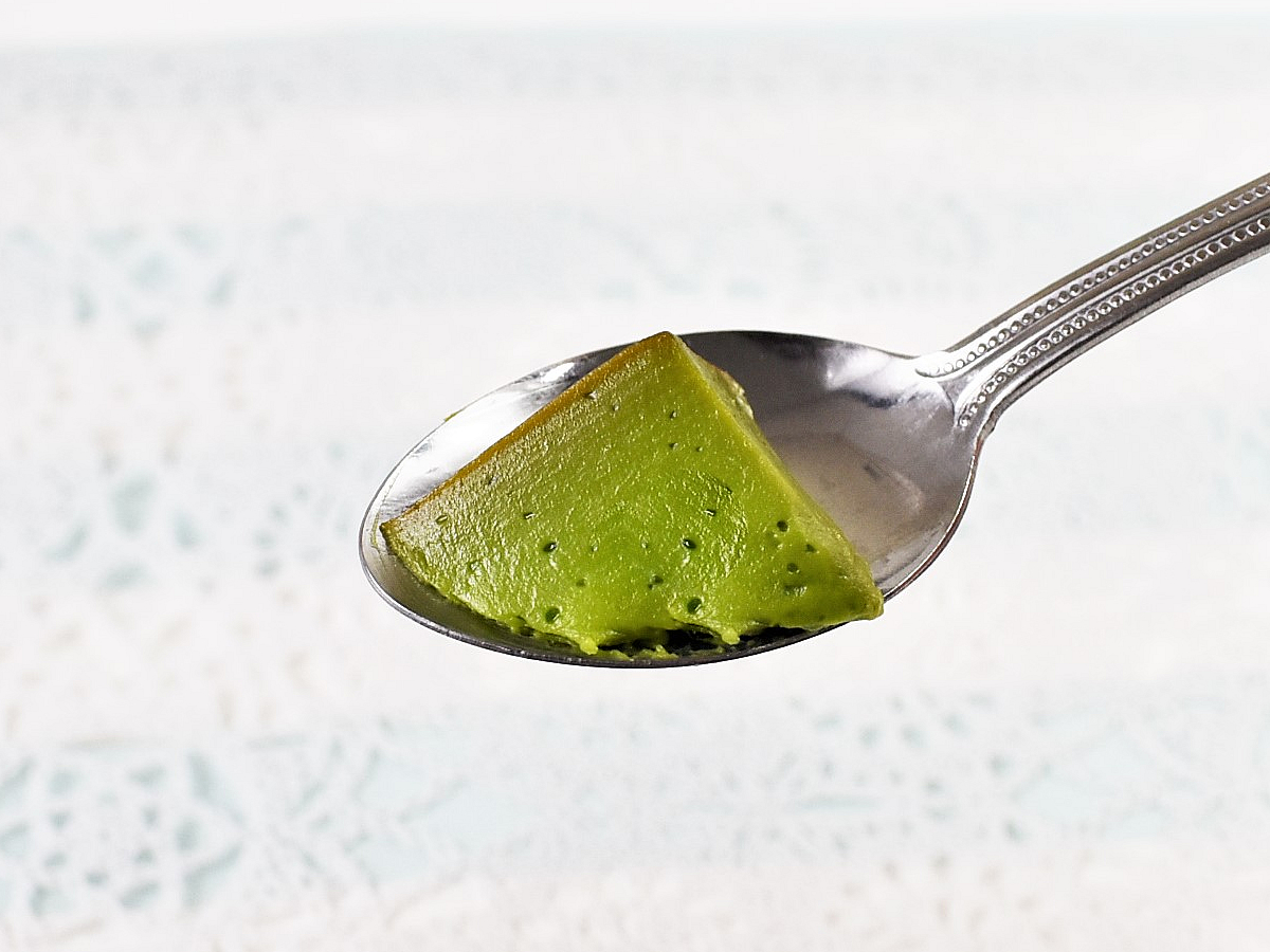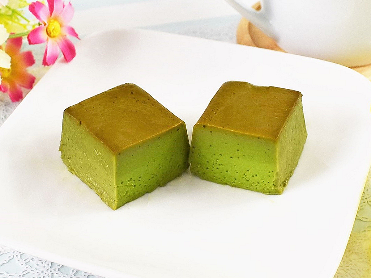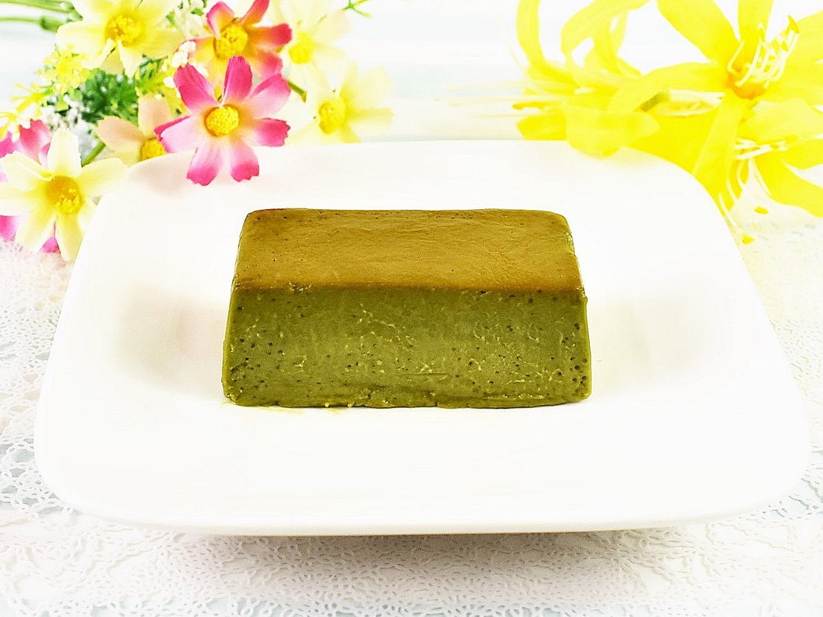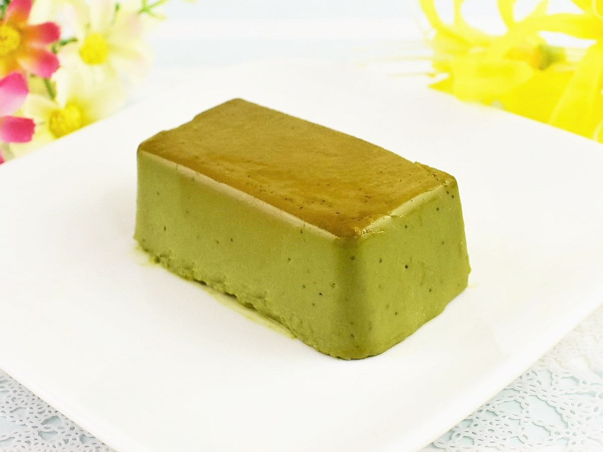 パッケージを開けると“ぷるぷる”のプリン… ではなく、重量感のある長方形型のプリンがお目見え。濃い緑色の見た目から芳醇な抹茶味が期待できそうです。