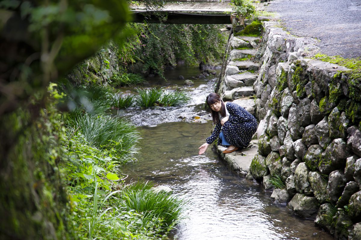街道の脇には花沢川がさらさらと流れています。石の階段は「ダンダン」と呼ばれ、かつて野菜などを洗う時に利用されました。川のせせらぎや鳥のさえずりをBGMにのんびり散歩していると、水車小屋や野菜の無人販売、古民家カフェも発見。