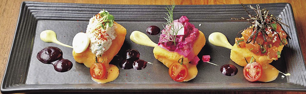 ワインと相性がよい料理を揃えたセットメニュー(Rp.49万)がお得でオススメ!写真はマッシュポテトにカニやマグロをのせた前菜メニュー「カウサ・トリオ」です。