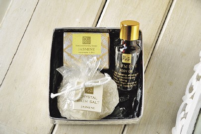 おみやげにぴったりのギフトセット(Rp.8万)には、石けん、クサンバのバスソルト、ボディオイルの3つが入っています。
