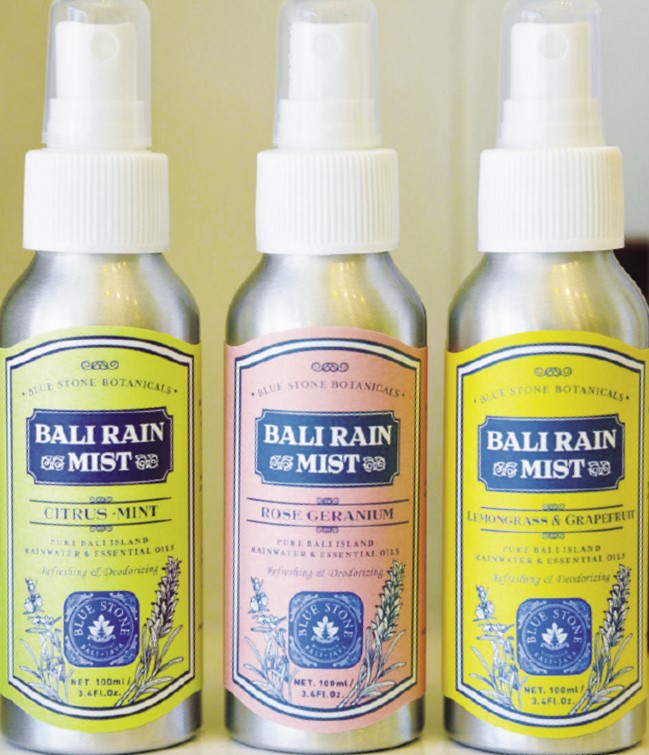 アロマテラピー理論や伝統の治療法に基づいたナチュラルコスメや、本格的なアロマグッズがたくさん!写真のアイテム「バリ・レイン・ミスト(各Rp.12万)」はバリの湧き水と精油で作られたフレグランスミスト(100ml)です。香水やピローミストに◎。