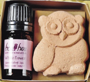こちらのフクロウ形のアイテム、アロマオイル&ストーンディフューザー(Rp.6万5000)なんです。アロマオイルはジャスミンやレモングラスなど5種類、ストーンは3色あります。