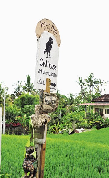 この看板が目印。田んぼの脇の小路を入っていくと到着です。画家シーラ氏の作品を購入することもできるバリ絵画のギャラリーも併設しているのでそちらもチェックしてみてください!