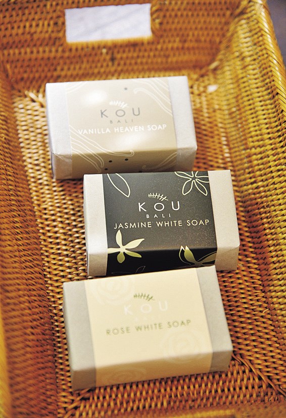 ナチュラルソープの専門店。定番アイテムの石けん(各Rp.3万~)には、バニラヘブン、ジャスミンホワイトなど9種類の香りと効能があります。