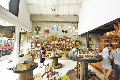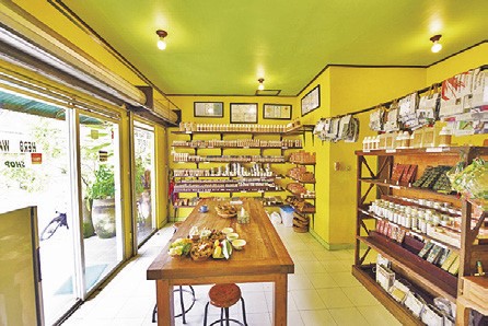 薬草や草花に囲まれたガーデンショップ。手作り石けんや塩、草木染めのバティックやアタ製のバッグなど、バリ島の自然にこだわった商品が揃っています。写真のアイテムはアロマワックス(各Rp.2万)。フランジパニやジャスミンなど、バリらしい4種類の香りがあり、ルームフレグランスやクローゼットにおすすめです。