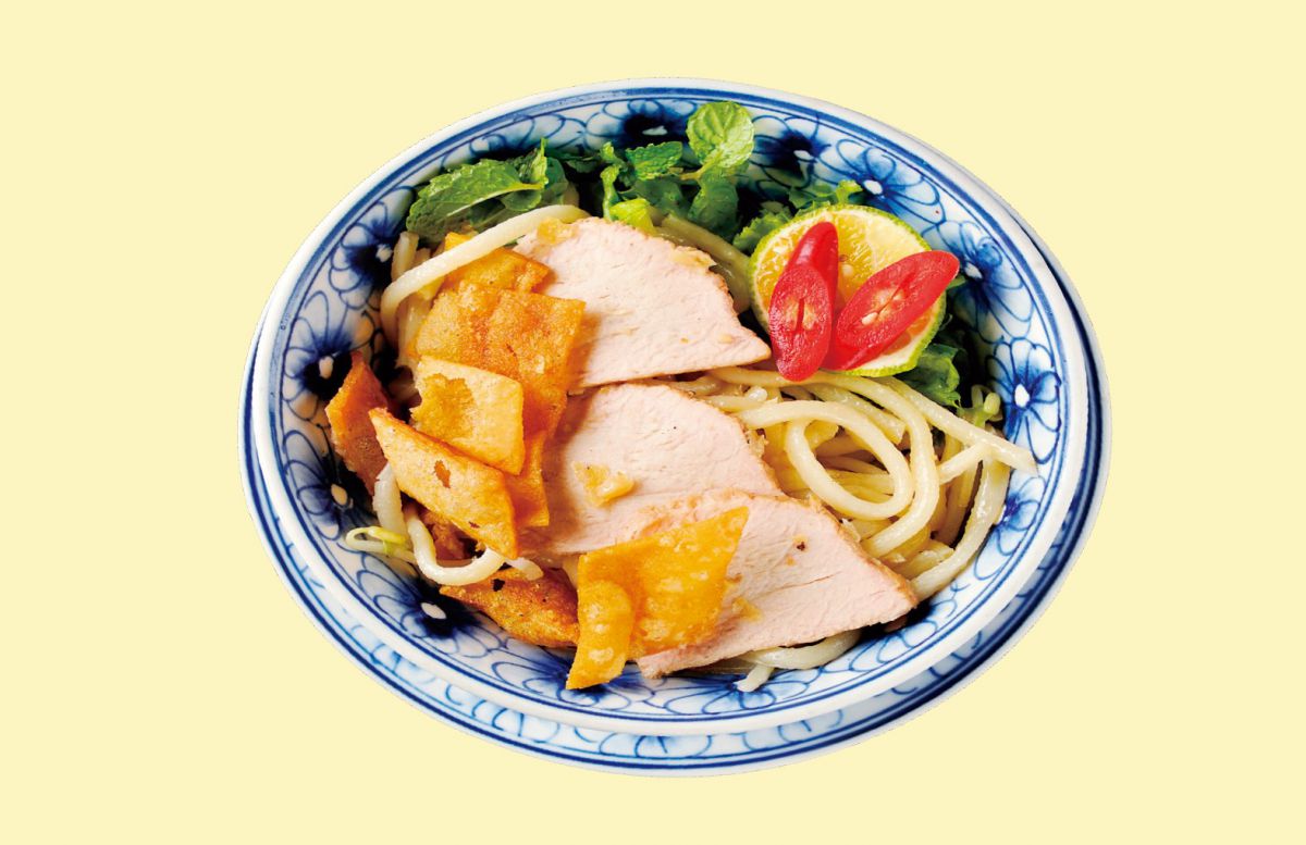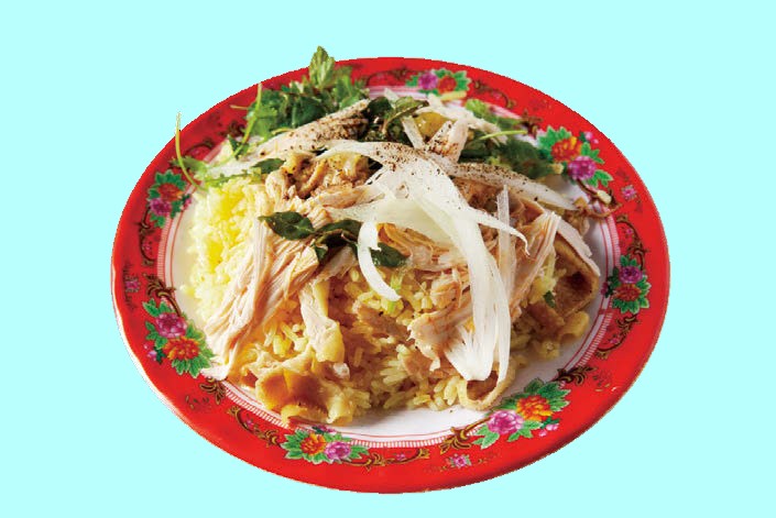 このお店のホイアン風鶏飯(3万5000VND)は、鶏ダシで炊き、ターメリックで色づけしたご飯に裂いた茹で鶏やタマネギ、ハーブがのっています。あっさりしながらもうまみの強い鶏飯は、好みでベトナム醤油を足して味わいましょう。さっぱりとしたサラダ仕立てがホイアンスタイルなのだそう。