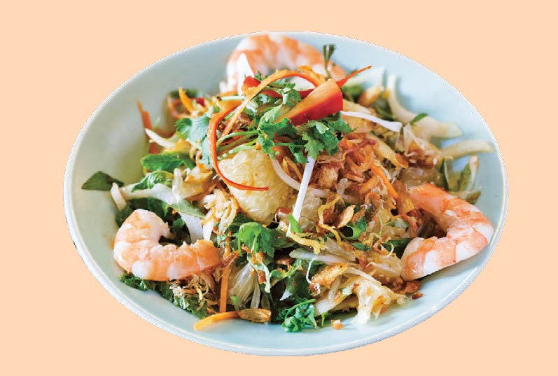 なんと約150種類にもおよぶベトナム全国の料理が勢揃いするお店。ザボンのサラダ(7万5000VND)は爽やかさ弾けるベトナム定番サラダ。エビや鶏肉に加え、みずみずしい歯ごたえのザボンがごろっと入っています。パクチーや揚げエシャロットが豊かに香ります。