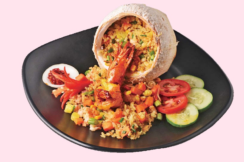 緑に癒されながら食事をたのしめる「シークレット・ガーデン」で食べるべきは、ビジュアルだけでテンションがあがるこちらの海鮮チャーハン(20万3000VND)。パラパラとしたベトナム米のよさが◎。ココナッツの殻を器にしたダイナミックな盛りつけが、この店の特徴なんだそう。