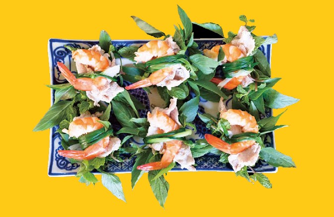 「オリヴィー」にはベトナムならではの家庭料理がたくさん!ハーブがたっぷりのエビと豚肉のハーブ巻き(6万6000VND)は、ホイアン近郊のチャー・クエ野菜村で生まれたおもてなし料理です。ミントやバジルを蒸し豚やエビとともにネギで巻いていただきます。