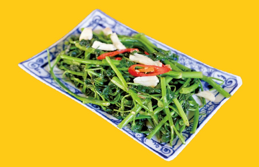空芯菜のニンニク炒め(5万8000VND)は間違いなしの鉄板メニュー。ニンニクの香りが食欲をそそる、ベトナムの定番おかずです。空芯菜特有の噛みごたえも相まって箸が止まらないおいしさなんです!