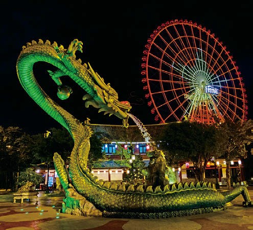 インドやタイなどアジアの各国をテーマにしたテーマパーク。高さ115mの巨大観覧車「サンホイール」は、実は日本から移築されたものなんです!アジアンチックな装飾とともに観覧車の夜景を撮りましょう。