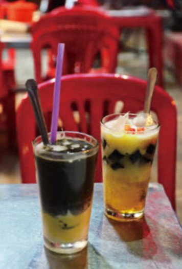 写真左は黒ゴマのチェー(1万5000VND)、写真右は寒天とザクロのチェー(1万2000VND)です。現地の方々に混ざって、ローカルな夜食をいただきましょう!