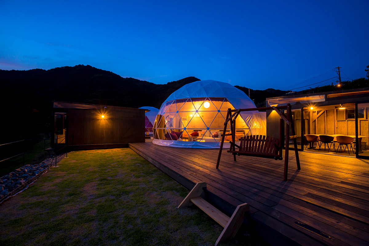 神戸の夜景や自然の眺望を堪能しながらラグジュアリーなアウトドア体験ができるグランピング施設。ドームはプライベートテラスがある「プライベートビューテラス」、最大10名宿泊可能な「デラックスビューテラス」「プレミアラウンジ」、2023年8月に新たに加わった天然ひのき風呂&バレルサウナを完備した「スパスイート・スイートビュー」、愛犬と泊まれる「スパスイート・スイートドッグ」など8タイプ全18部室。食事は国産黒毛和牛ステーキをメインに地元農産物や海産物を使用したグランピングBBQコースを用意。キッズコースもあります。宿泊者は敷地内のホテルにある銀河の湯を無料で利用できるので源泉かけ流し温泉も楽しめます。