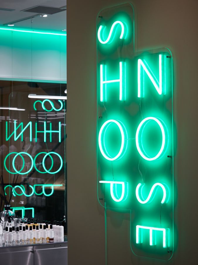 目を引くブランドロゴはOが横並びの部分が鼻を表しており、グリーンのネオンには青信号の「進め」というメッセージが込められています。