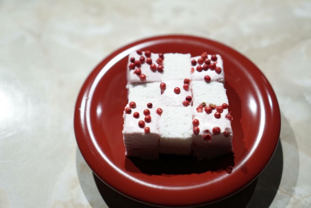 「ペアリングのワインの余韻の香りが素晴らしく、そこにピンクペッパーをプラスすることでお菓子、ワインそれぞれ単体では味わえない複雑味を出せたら」と考案されたのが「白ワインとピンクペッパーのギモーヴ」。角を感じないほど、口の中でふわりと溶けるギモーヴの食感は、ほかに例えようがなく、ベースにしたフワンボワーズの甘さも上品です。