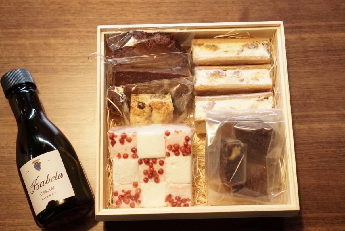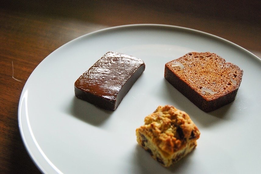 井本氏からは「キャラメル風味のクルミのパウンド」「テリーヌショコラ」「ドライイチジクとチーズのスコーン」の3点をお届け。ワインとの相乗効果を考え、レストランでも必ず出しているキャラメルパウンドケーキはマストに、さまざまな角度からワインを愉しめるお菓子たちです。