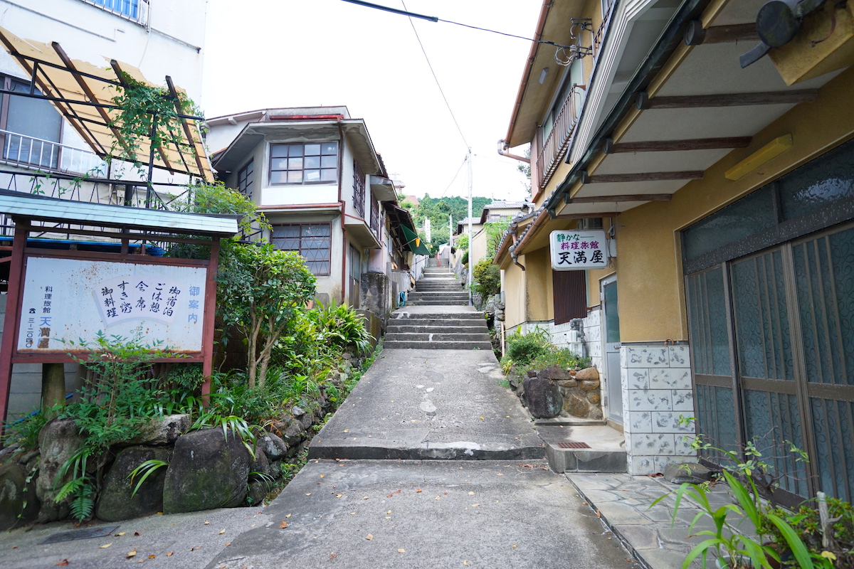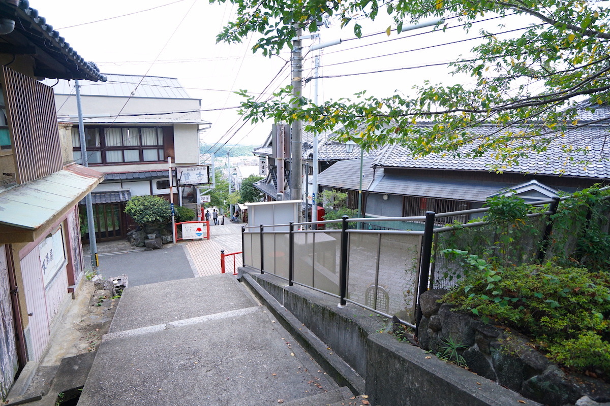 ケーブルカーを降りると一気に雰囲気が変わり、急な坂道や石段などがあちこちに現れて旅情気分が高まります。「宝山寺駅」から「雲亭」までは、石段や坂道を登って徒歩10分ほど。