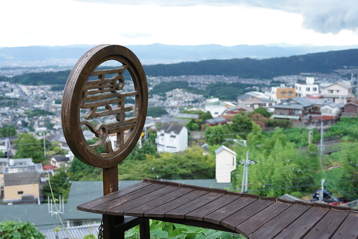 木のアーチをくぐるとすぐに圧倒的なパノラマが! 奈良盆地が目の前に広がり、この景色だけで爽快な気分へと誘われます。