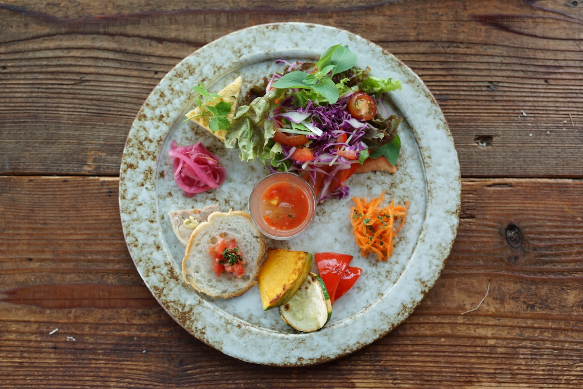 この日の前菜盛り合わせは、スペイン風オムレツ、ピクルス、鶏肉のパテ、サルサソースがのったバゲット、奈良の焼き野菜、ニンジンのラペ クミン風味、ガスパチョ。色彩豊かなプレートが食欲を刺激します。