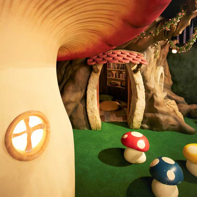 ジャンボキノコと小人のおうちは、どんな風に撮影しても間違いなく絵になるスポット。家の中の本棚やテーブルが写り込むアングルを狙えば、よりリアルに!撮った後は、小人のおうちの中でゆったり読書をどうぞ。