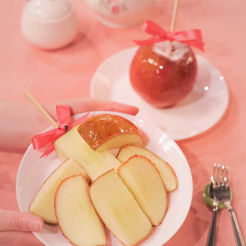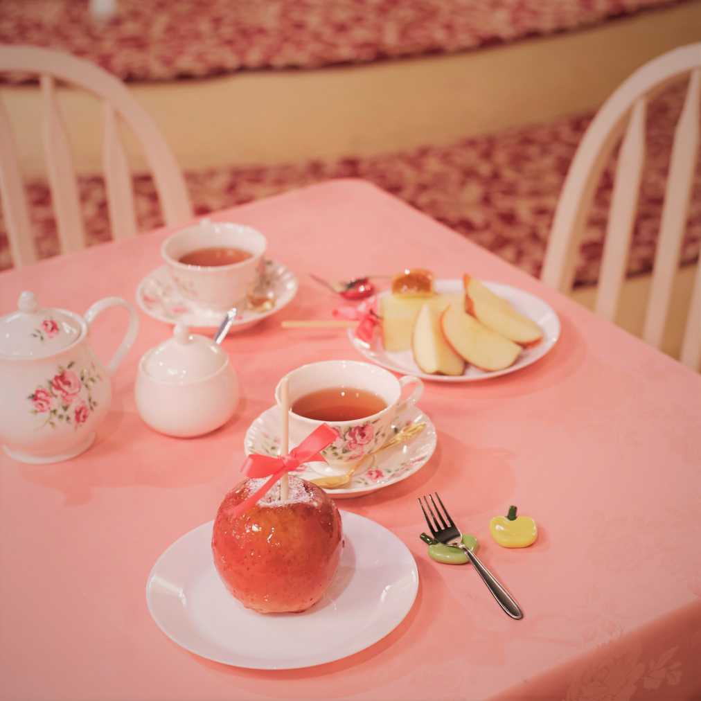 お茶会の主役は、生のリンゴを丸ごとキャンディーでコーティングした「元町りんご飴-白雪姫のスウィートアップル-」(500円)。これが、想像を絶するおいしさなんです。果実のジューシーさと、飴のシャリ&パリッが新食感。縁日で見かけるリンゴ飴とは、ひと味違います。