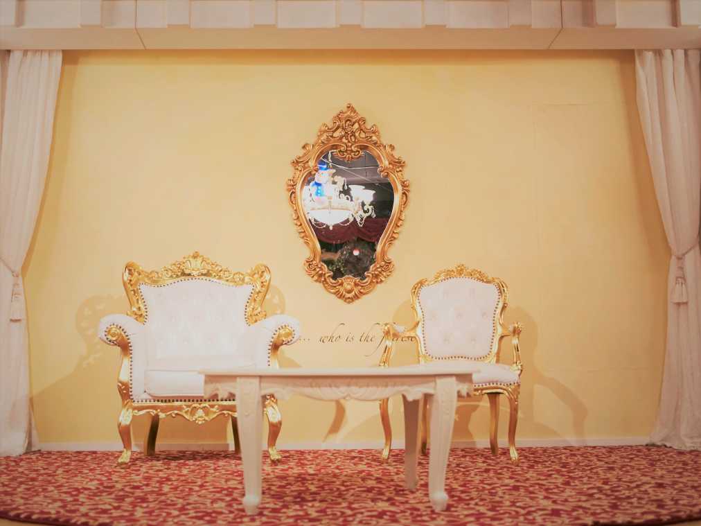 赤い絨毯のステージには、王子様と白雪姫が座る黄金の椅子が。ステージに上がったり、椅子に座ったりと、自由に撮影OK。壁に掛かっているのは……、物語にも登場した魔法の鏡です。鏡にシャンデリアを写り込ませると、豪華なお城っぽさが出てステキ!