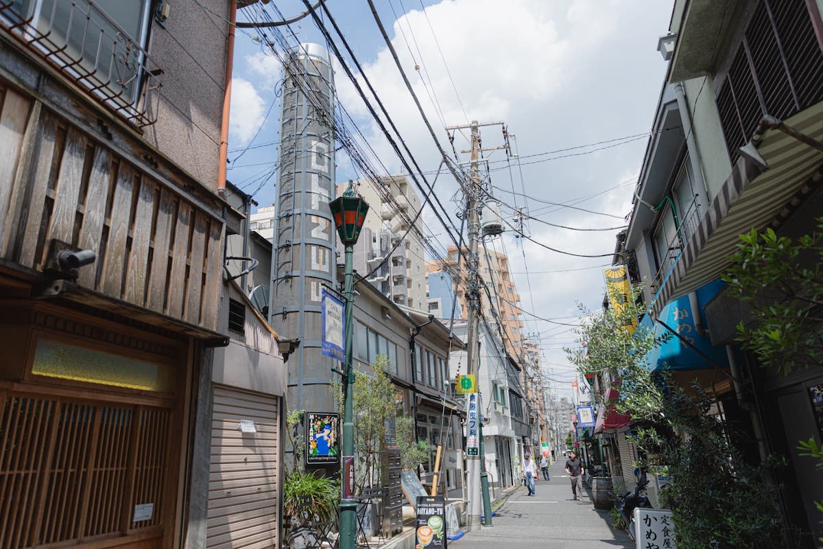 「MATCHA & ESPRESSO MIYANO-YU(まっちゃ あんど えすぷれっそ みやのゆ)」は、風情ある路地裏にひっそりとたたずむカフェ。東京メトロ千代田線根津駅1番出口から徒歩約5分の、根津神社にほど近くどこか懐かしい雰囲気が漂う路地の一角にあります。大通りから細い路地へ入り、人気のパン屋「根津のパン(ねづのぱん)」を通り過ぎた先に、目印となる銭湯の煙突が見えてきます。