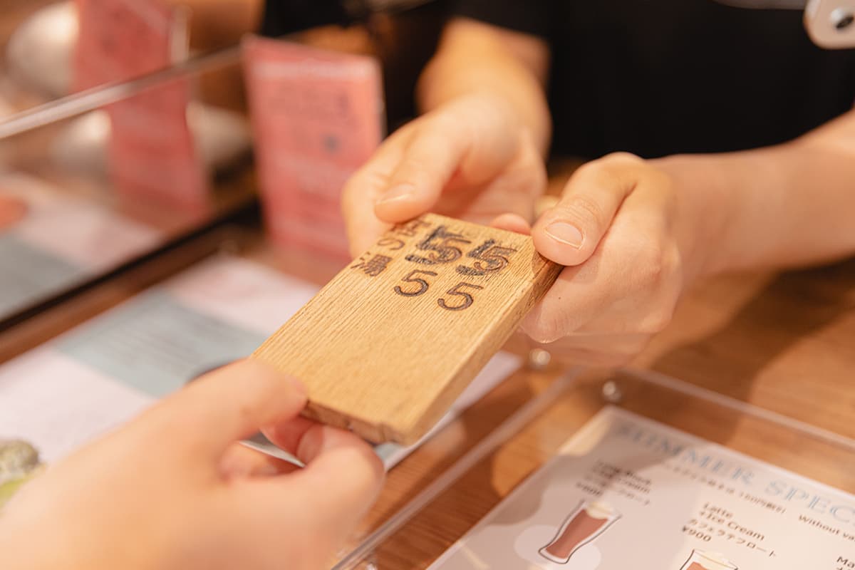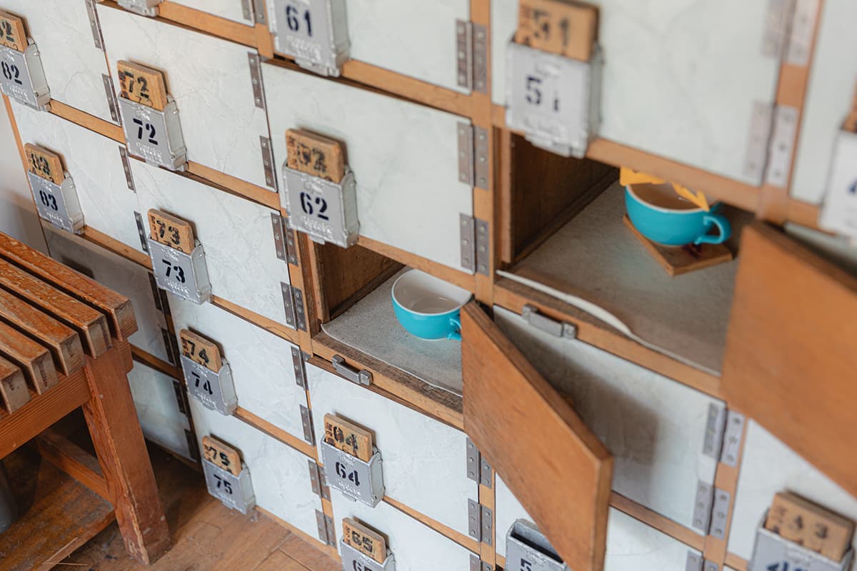 カウンターにて飲み物をオーダーすると引き換え札として手渡されるのは、下駄箱の鍵。建物そのものの歴史だけでなく、こうした細かな部分にまで銭湯の記憶を大切に継承しているのが、このカフェの魅力の一つです。