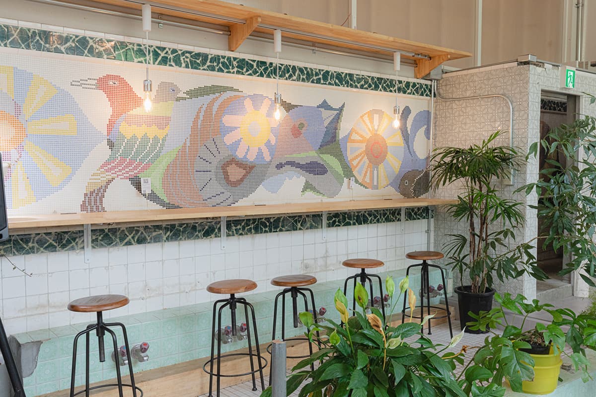 そしてなんといっても目を引くのが、カフェスペースに入って右手にあるカウンターのタイル。美しく保たれているのでリノベーション後に新しくデザインしたのかと思いきや、なんと「宮の湯」時代からのタイルが残されているのだとか。魚や鳥のモチーフがアクセントとなった珍しいデザインで、現在では作ることが難しいそうです。