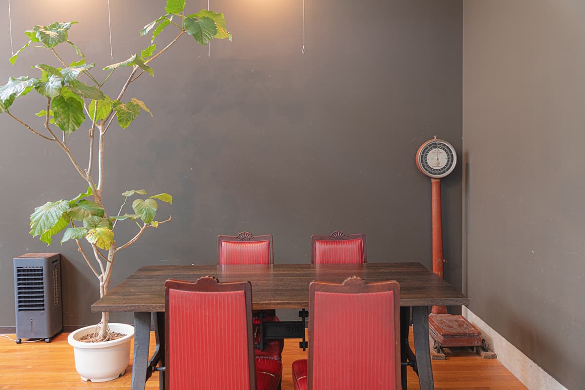 奥へ進むと、かつて脱衣場だったスペースにも座席が設けられています。写真の右側に見えるのは、「宮の湯」時代に脱衣所で実際に使われていた体重計。そのままの姿で残されていますが、さすがに今は動かなくなってしまったそうです。