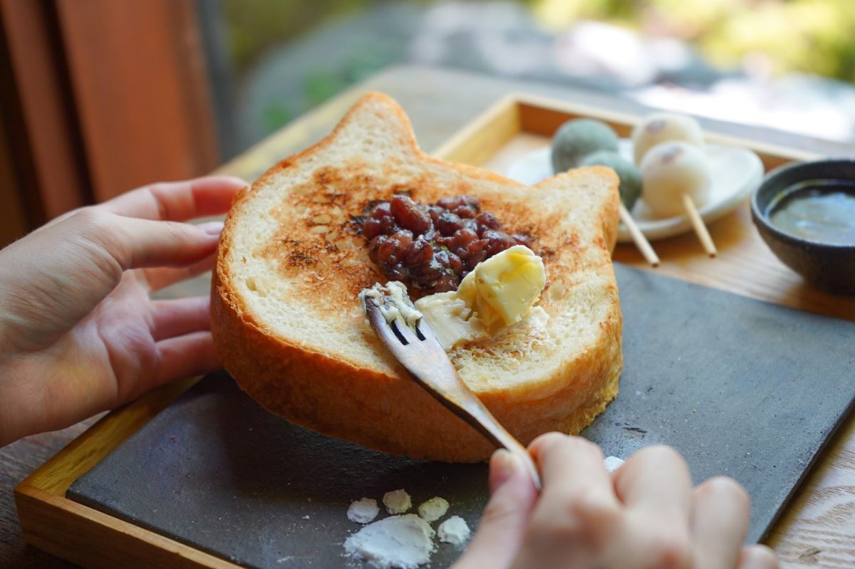 「ねこねこ食パン」は、北海道産の小麦を100%使用。水は一切使用せず牛乳と生クリームで仕上げたミルキーな味わいの高級食パンなので、そのままトーストして食べても十分美味しいのですが、『eXcafe京都嵐山本店』ならではのトッピングも楽しんで。