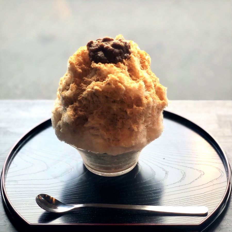 沖縄県産黒糖で作る濃厚な黒蜜と、香ばしい国産きな粉がたっぷりかかった「黒蜜きな粉」1100円。仕上げに北海道産の大納言小豆のつぶ餡をトッピングした和テイストのかき氷。
