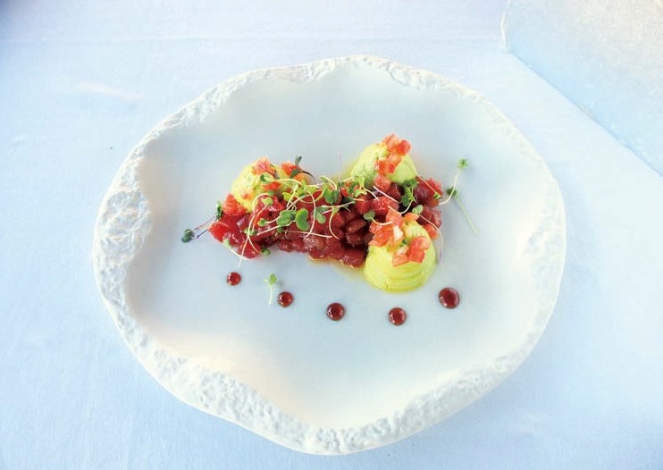 サイドメニューの「タルタル・デ・アトゥン」は、見た目の美しさだけでしあわせな気持ちに。もちろん味も◎。刻んだマグロにアボガドのペーストを添えています。€24.80