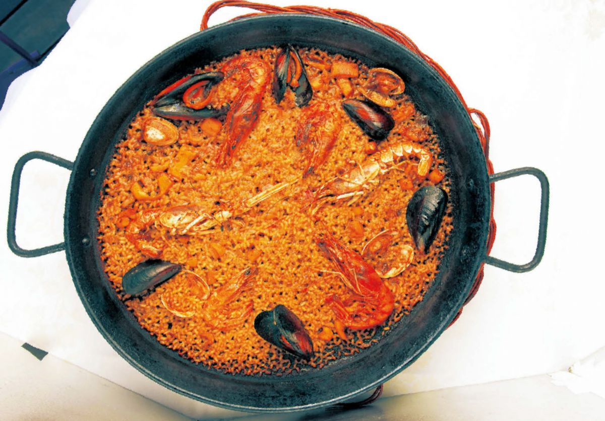 おすすめのパエーリャは「アロス・ア・ラ・パエーリャ・コン・マリスコス」1人前、€20。手長エビ、イカ、ムール貝、アサリ、ハマグリとシーフードが盛りだくさんです!オーダーは2人分から。