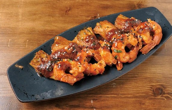 炒めたアーティチョークとエビを、醤油とゴマのソースで味付けしたこちらもオススメ。€10.90。
